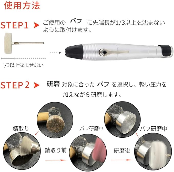 【リューターバフ用途】:汚れ落とし、金属(貴金属)の最終艶出し作業、品質の良いバフを使用し、表面に傷つけることなくソフトに仕上げます。金属表面の洗浄、粉砕、ダスティング、バリ取り、研磨、残留物の除去、酸化物の除去に適す。作業時間を大幅に短縮できるでしょう!