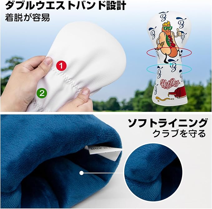 ゴルフクラブヘッドカバー ホットドッグ 刺繍 溢れウッドカバー ドライバー フェアウェイウッド ユーティリティ ハイブリッド用ヘッドカバー 番号タグ付き パターカバーマグネット開閉 ブレードパターカバー