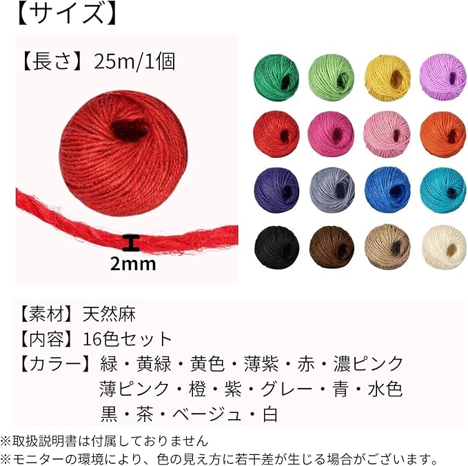 【サイズ】長さ25m/1個、太さ2mm【素材】天然麻【重量】440g 【内容】16色セット 【カラー】緑・黄緑・黄色・薄紫・赤・濃ピンク・薄ピンク・橙・紫・グレー・青・水色 ・黒・茶・ベージュ・白※取扱説明書は付属しておりません※モニターの環境により、色の見え方に若干差が生じる場合がございます。