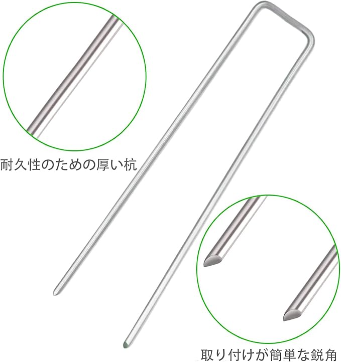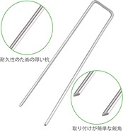 【広く用途】:防草シート、人工芝、農業用防虫ネット、不織布、ビニールマルチ、各種シート・マット等を地面に設置・固定できるU字型ピンの商品です。