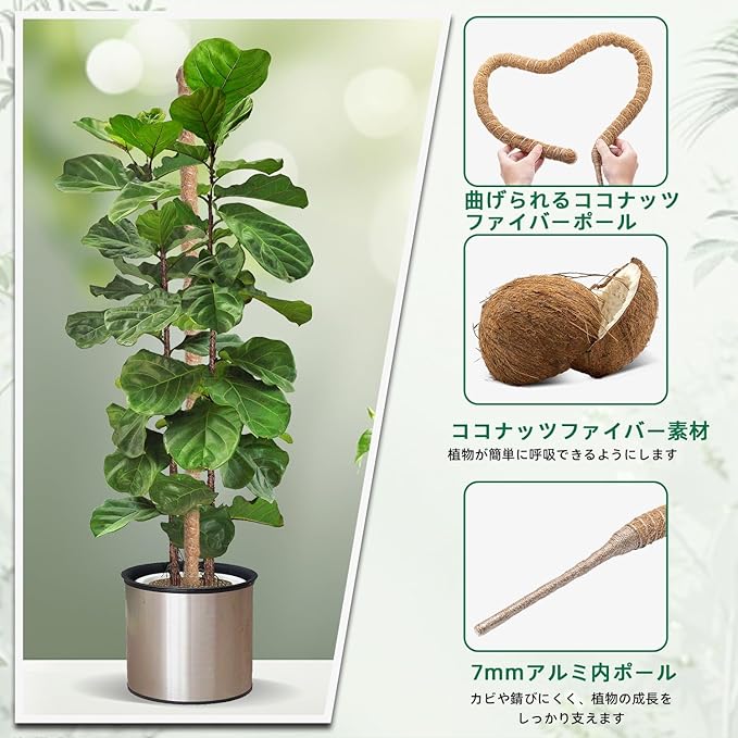 排水性、保水性に優れる:この観葉植物支柱は、通気性と排水性に優れつつも保水性を確保する天然ココナッツ繊維で作られています。環境に優しく、植物の健康促進にも寄与します。このココナッツ支柱は内部にアルミロッドを備えており、植物に強固なサポートを提供します。植物が成長しても安心で、長期間の使用に適しています。