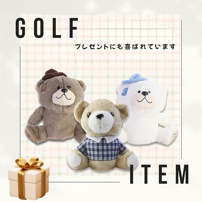 ベレー帽をかぶった茶色のくまさんと白色のくまさんの二種類と、青いチェック型のシャツを着たくまさんがラインナップ!ゴルフプレイ中でなくてもお家で飾っていても十分にかわいいです!