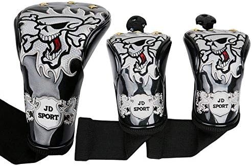 ヘッドカバー 高級pu革ドライバー/ウッド用 FW 3点セットスカル模様 刺繍入 防水仕様 変換ダグ付き セレクトプラザ