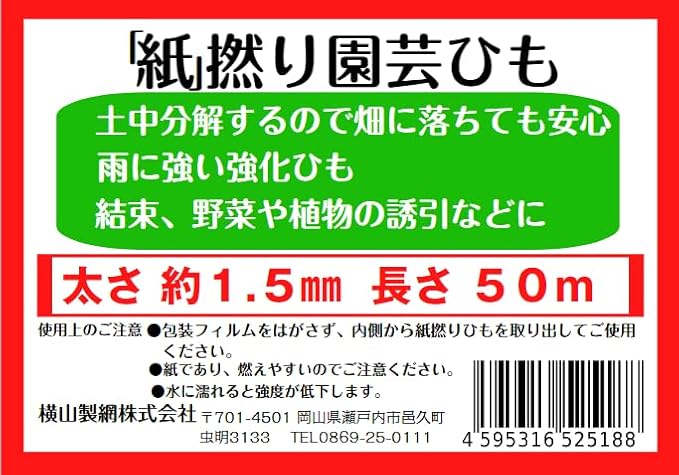 農業や手芸に使える紙撚りひもです。土中分解するので畑に紙糸が落ちても安心です。結束や、野菜、植物の誘引などにお使いいただけます。