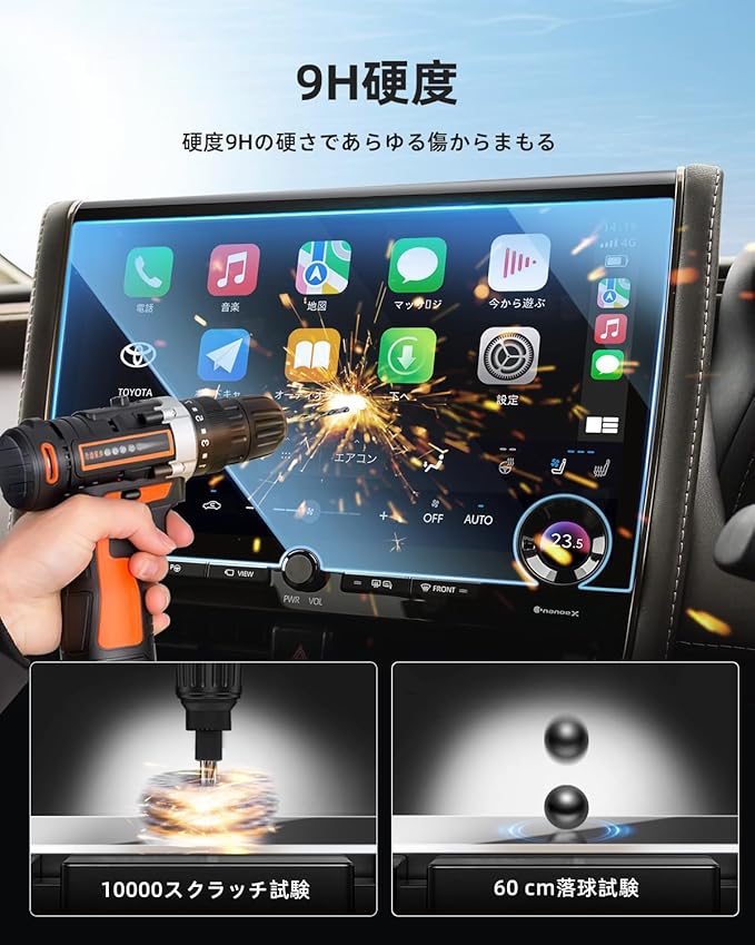 【9H高硬度ガラスフィルム】アルファード40系 保護フィルムには9H硬度素材を採用し、ガラスを強化することで外界からの衝撃(鍵や硬いものなど)を吸収し、映像へのダメージを最小限に抑えます。 貼った事で傷が付かない安心感で生まれました。