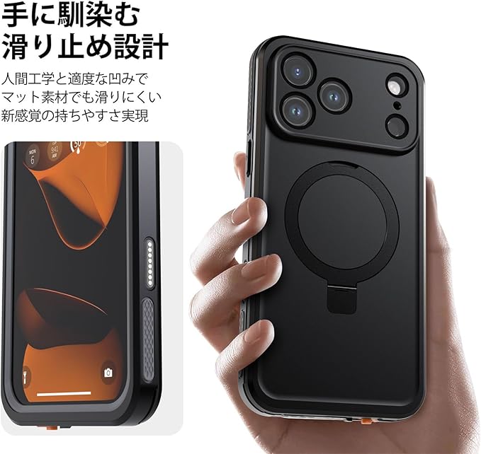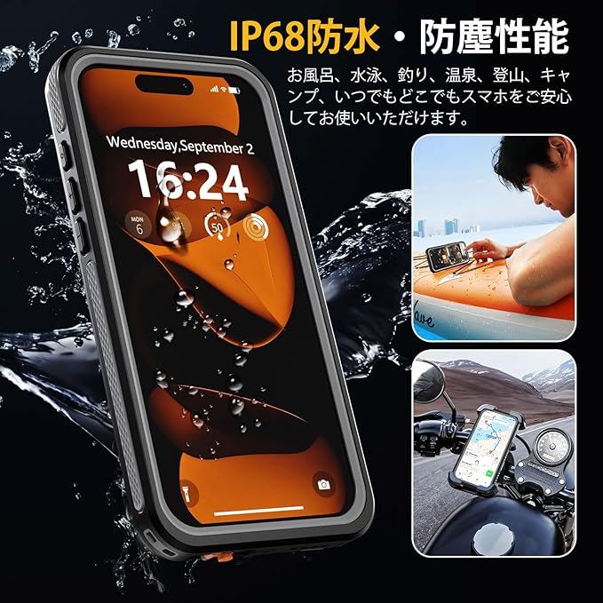 【IP68防水認証取得】iPhone 17 Pro Max 専用の完全防水防塵ケースです。最高防水レベルのIP68認証を取得し、水深さ2Mの水中に1時間まで水没でき、さらに水中撮影でも対応出来ます。防水機能だけでなく、砂・ホコリ・ゴミなどの侵入も防ぎますので、お風呂、水泳、釣り、温泉、登山、キャンプ、いつでもどこでもスマホをご安心してお使いいただけます。