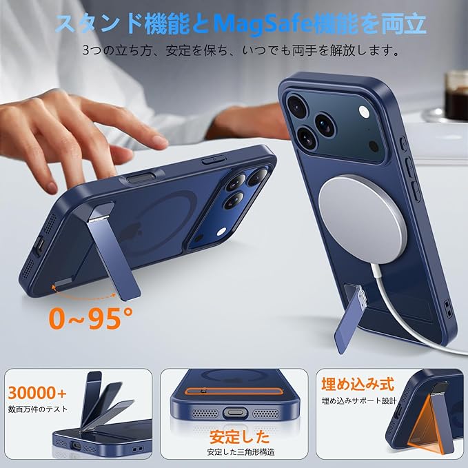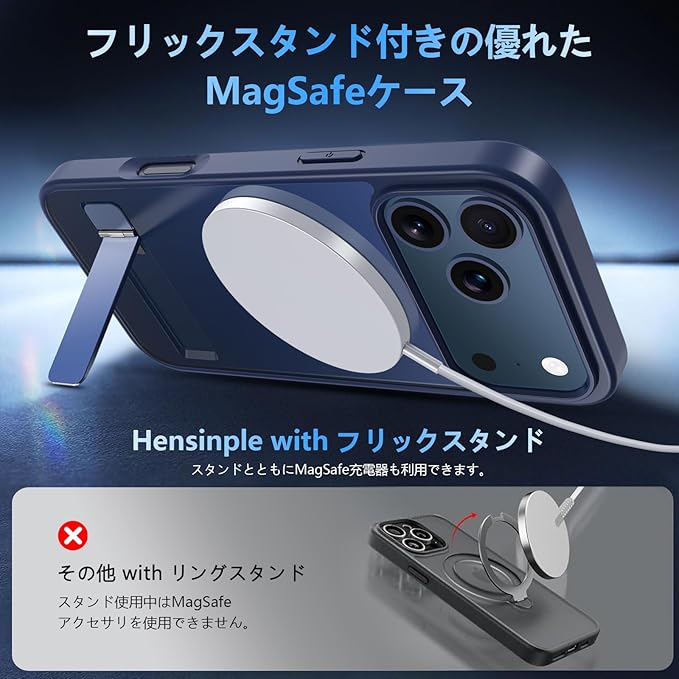 iPhone 17 Pro Max ケース [ガラスフィルム・スタンド機能・MagSafe対応] いphone17promax ケース Hensinple 半透明 縦横両対応 調整可能 隠しスタンド 全面保護 耐衝撃 アイホン17プロマックスカバー 指紋防止 マグネット搭載 マグセーフ対応 ストラップホール付き iPhone 17 Pro Max スマホケース 6.9インチ用 ブルー