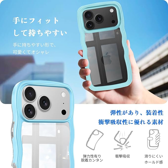 【全方位保護】ケースのカメラ部分は、 あいほん17 Pro Max のカメラレンズよりも高い位置に設定されており、レンズを傷から守ります。また、波型のエッジにはある程度の厚みを持たせているので、万が一 いphone 17 Pro Max を落下させてしまった場合でも、通常のケースよりも全方位的に大切なレンズと画面を保護します。