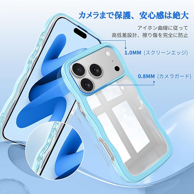 iPhone 17 Pro Max 用 ケース 波型 クリア 透明 背面ケース スマホケース 可愛い アイフォン17 Pro Max 用 カバー 耐衝撃 滑り止め ストラップホール付き 青 ウェーブ おしゃれ デザイン 全面保護 iPhone 対応 カバー 持ちやすい 6.9インチ 韓国 人気 ブルー