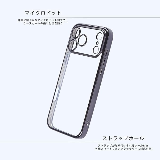 【洗練された輝きで、日常に安心をプラス】iPhoneのエレガントなデザインを損なうことなく、確かな保護性能で日々のあらゆるシーンをサポート。シックなブラックのメタリックフレームが、あなたのデバイスをワンランク上のスタイルへと昇華させます。