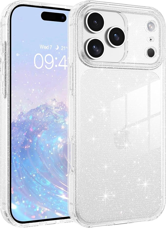 【キラキラ輝く・軽量薄型】透明TPU+PCにキラキラ粒子を練り込み、iPhone 17 Pro Max の本体色を引き立てつつ、上品な華やかさをプラス。光で変わる輝きが、日常を特別にかわいくします。薄型軽量でポケットにもすっきり。側面の滑り止め加工で持ちやすく、黄ばみ防止でずっと透明な美しさを持続。