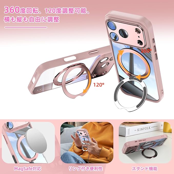 [ShinKin] スマホケース iPhone 17 Pro Max 用 ケース カバー 透明PC + TPU素材 ケース リング付き カバー スタンド機能 スマホケース 透明レンズフィルム保護機能付き 強化された保護 携帯電話のレンズフィルム 軽量 耐衝撃 擦り傷防止 落下防止 車載ホルダー 360 回転 ケース iPhone 17 Pro Max 用 (ピンク)