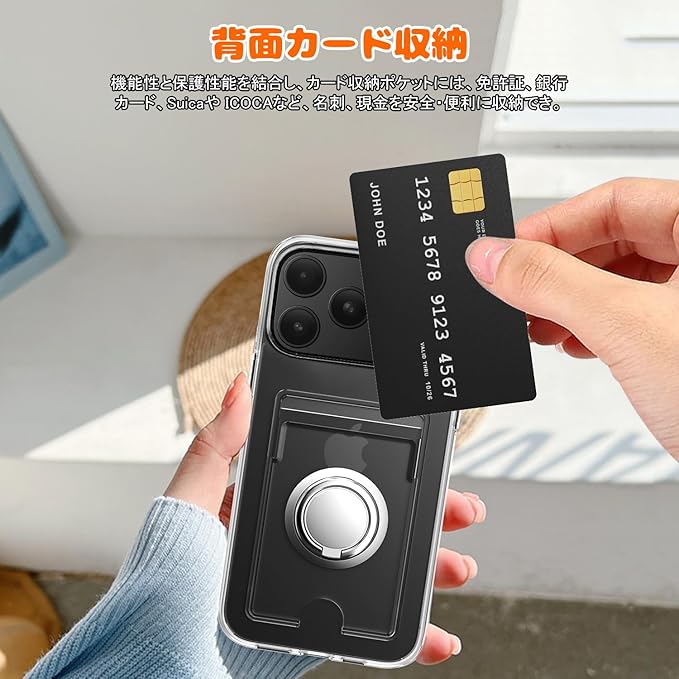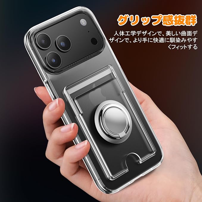 対応 iPhone 17 Pro Max ケース 透明 カード収納 リング付き 耐衝撃 保護カバー アイフォン17プロマックス スマホケース クリア シリコン スタンド機能 耐久 滑り止め (クリア)