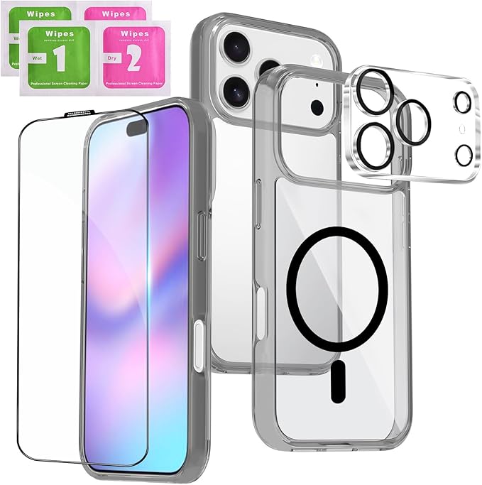 i-Phone17 Pro Max ケース セット 半透明 マグセーフ対応 強化ガラスフィルム レンズプロテクター付き 耐衝撃 軽薄 指紋防止 6.9インチ 2025年モデル専用 画面保護 カメラ保護 [3点セット] ブラック