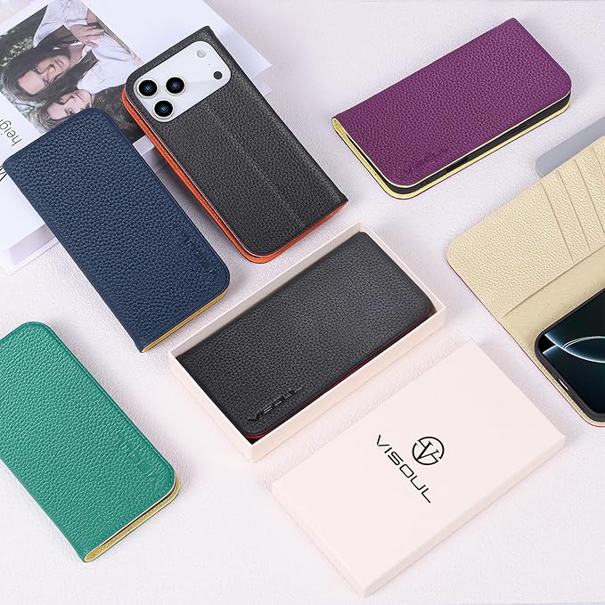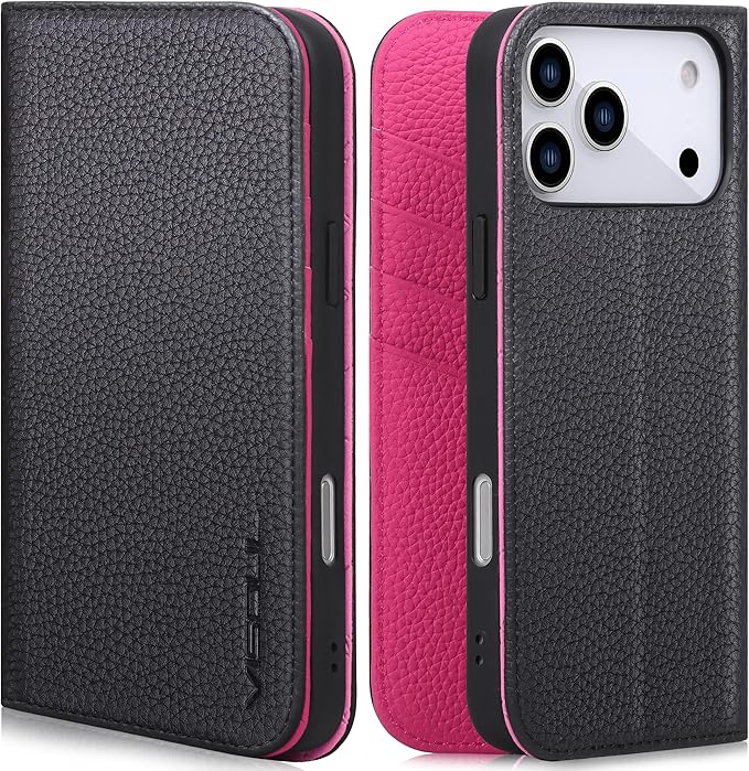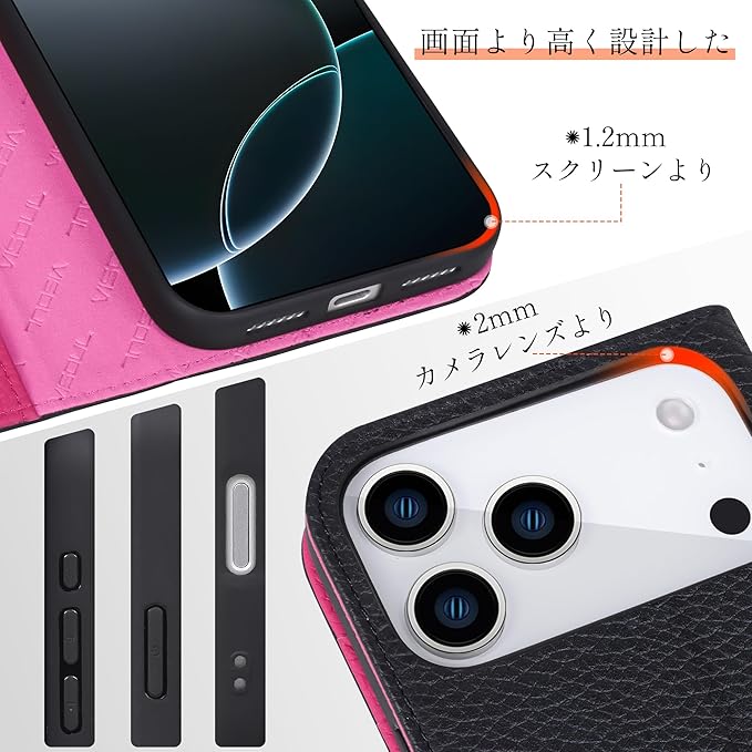 VISOUL iPhone 17 Pro Max 対応 ケース 手帳型 本革 アイフォン17 プロマックス 手帳型ケース MagSafe対応 スマホケース レザー カード収納 携帯カバー 横置きスタンド機能付き マグネット式 全面保護 柔軟なTPU素材 アイホン17 ProMaxブラック・マゼンタ