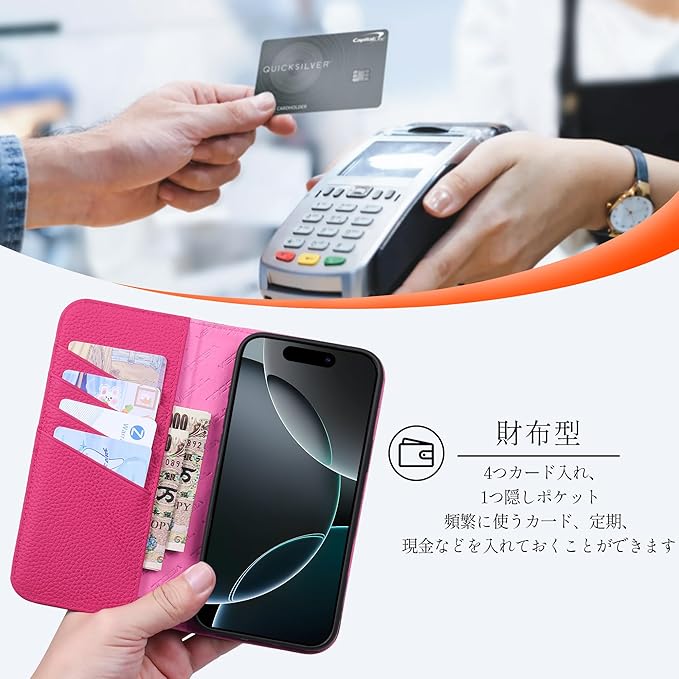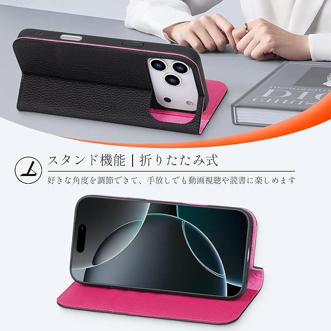 収納機能、横置きスタンド機能:iPhone17 ProMaxケース内側に実用性のカード入れポケット 4、内側ポケット 1、カード類、現金、名刺、免許証入れなどを収納でき、通勤も通学にも楽々タイプです。マグネットが内蔵されているので、ベルトがなくてもフタがぴったり閉まります。横置きスタンド機能が付きまして、好きな角度を調節できて、手放しでも動画視聴や読書に楽しめる。