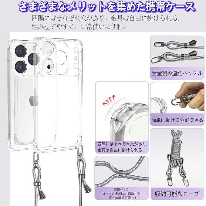 Muciyazi ケース 用の iPhone 17 Pro Max クリア ショルダー カバー 肩掛け 斜めかけ 縄掛けケース 透明 薄型 軽量 TPU 携帯ケース 紐付き 斜めがけ 織りストラップ付き 長さ調整可能 取り外し可能 落下防止 紛失防止 ワイヤレス充電対応(シルバー)