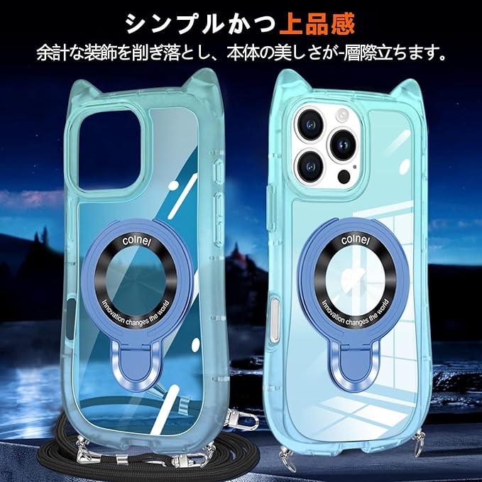 iPhone 17 Pro Max 用 ケース クリア MagSafe対応 リング付き TPUバンパー ネック ショルダー あいほん17promax カラー猫耳携帯カバー 肩掛け 首掛け 斜めがけ 紐付き 韓国 かわいいファッション 耐衝撃 車載対応 アイフォン17promax スマホケース