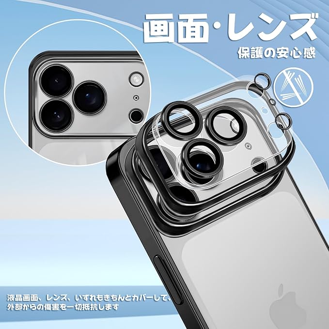 iPhone 17 Pro Max 用 ケース クリア ガラスフィルム アイフォン 17 ProMax カバー iphone17ProMax スマホケース 透明 TPUバンパー 薄型 ストラップホール付き ワイヤレス充電対応 6 .9インチ クリアケース ブラック