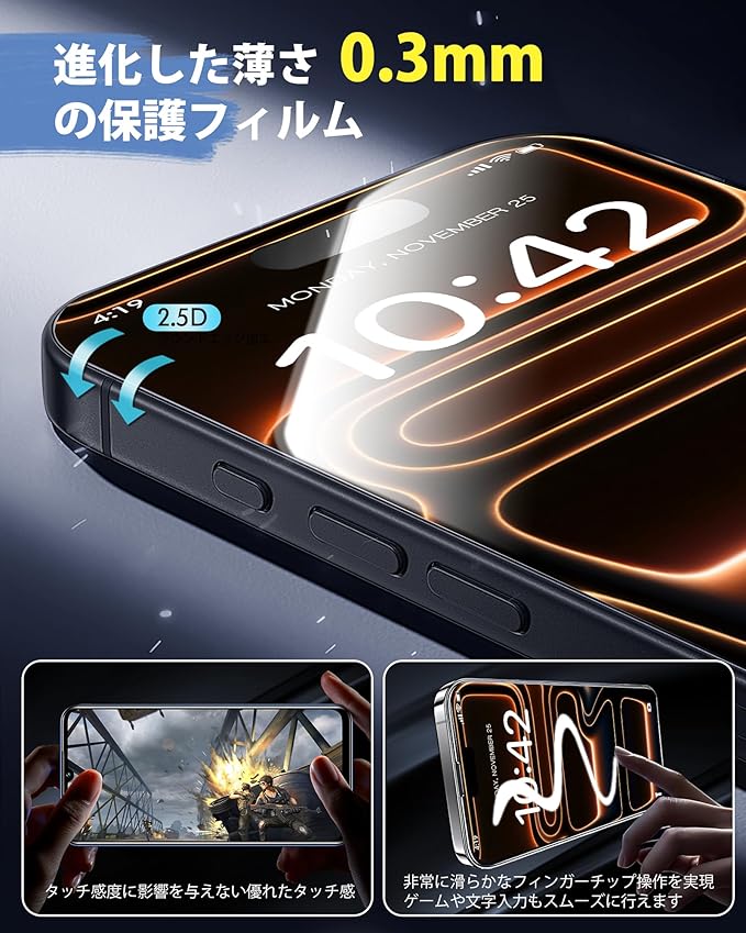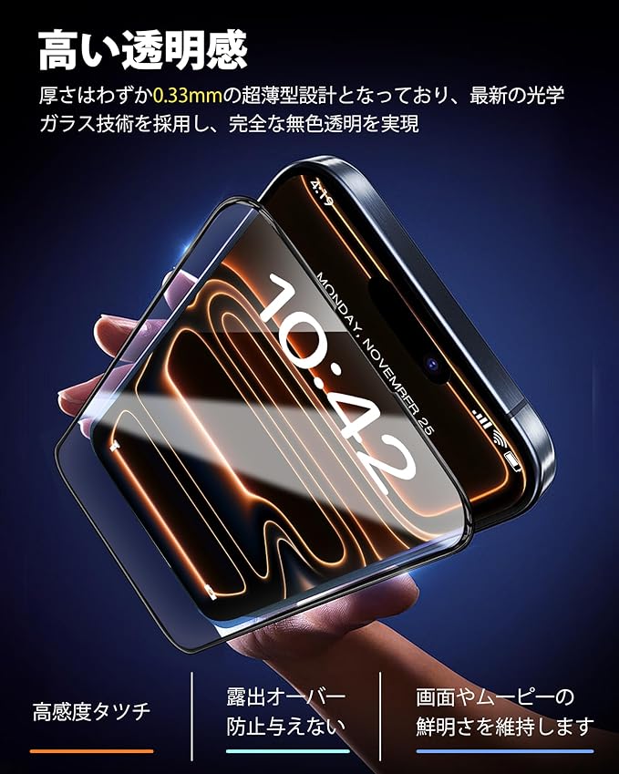 【99.99%光線透過率 一体感抜群!】iPhone 17 液晶画面保護ガラスフィルムは、透き通ったガラスフィルムには多層コーティング技術を採用し、優れた透明度を確保いたしました。これにより、本来の画質を一切損なうことなく、鮮やかな色彩再現性と精細な表示を維持し、美しい画面を忠実に保ち続けます。視覚的なクリアさと没入感をお楽しみいただけます。本体との一体感のあるデザインとなっており、装着後もスマートフォンの美観を損なわず、ケースとの組み合わせにも優れた適合性を発揮します。機能性と美的調和を両立した製品となっております。