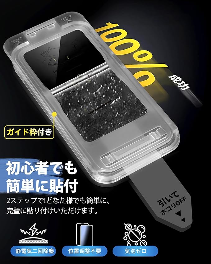 【初心者でも簡単に貼り付け 気泡ゼロ】ご自身でフィルムをお貼りいただく際に、保護ガラスの位置合わせと貼り付けを容易にするための工夫を施しております。初心者の方でも簡単にインストールいただけるガイド枠を装備しており、ずれや気泡の発生を防ぎます。ご失敗いただく心配なく、簡単に貼り付けていただけます。気泡も自然に消えていくため、どなた様でも美しく仕上げられます。