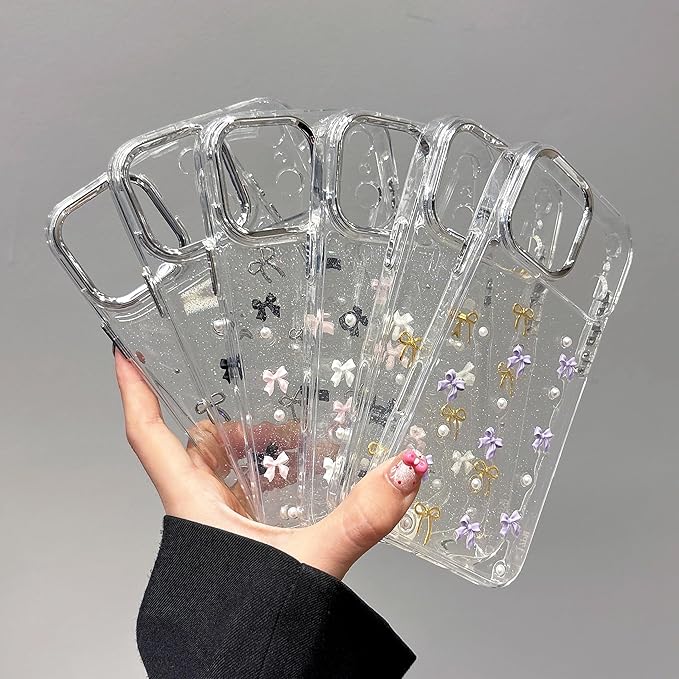 【3D ミニリボン デザイン 】背面はシルバーの小さなリボンと、埋め込まれている目を引くグリッターが剥がれ落ちたりしなく、可愛い、流行りの韓国デザインです!カメラ周りのシルバーフレームは、取り外し可能なデザインとなっております、お好みに合わせて、シルバーフレームの有無ご利用くださいませ。