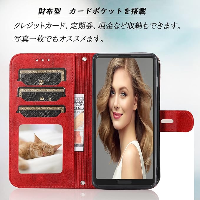 ❷【機能性 4in 1】①横置きスタンド機能:お好きな角度で動画鑑賞や読書などを楽しめます;②財布型:ケースの裏側に 3つのカードポケット, お札入れのフリーポケット一つ、名刺や定期券の収納に優れていて、ちょっととしたお出かけてもこれで十分です;③ベルトマグネット搭載、カバーを自動的に開けないようなデザイン;④落下防止ストラップ付きき(ストラップホール二つあり)、ストラップは手首に通して使うのに適した長さで、落下事故の予防になります。仕事で長時間手持ちのまま使用するお客様にオススメ♪ または各種ボタンの使用、カメラ撮影等、すべての機能もそのまま立て掛けて稼働します;