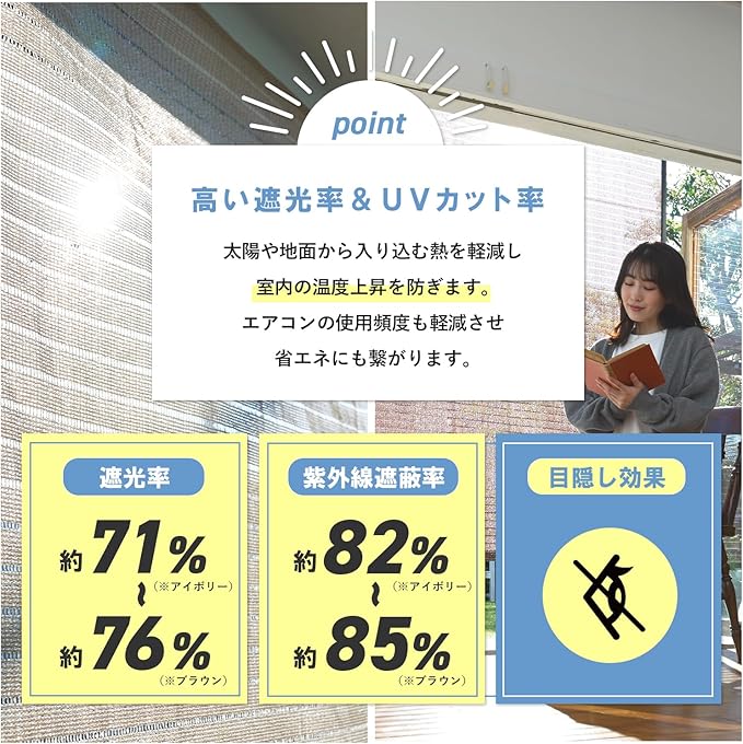 ●遮光率約76%で、近隣からの目隠し効果としても活躍します。ベランダでくつろぐ際に人の目が気になる方にもおすすめです。