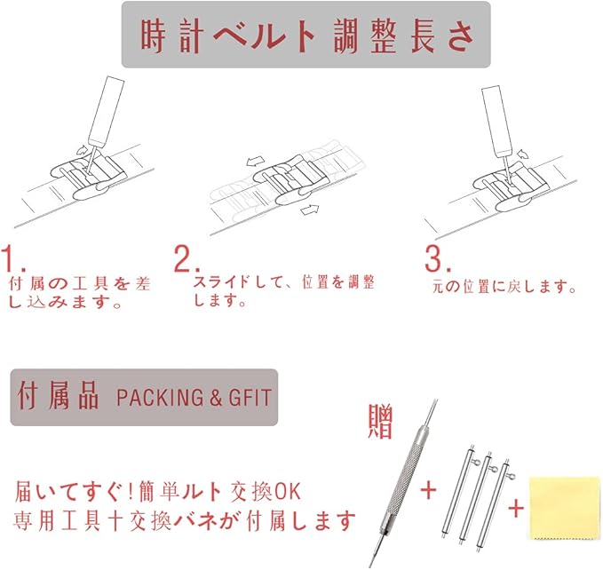 【 クイックリリースバネ棒 と クラシックバネ棒】自由に選べる2種類のバネ棒用意されています。クイックリリースバネ棒、工具なしでウォッチバンドの取り付けと取り外しができます。クラシックバネ棒安全設計で、時計とストラップをより確実に固定します。