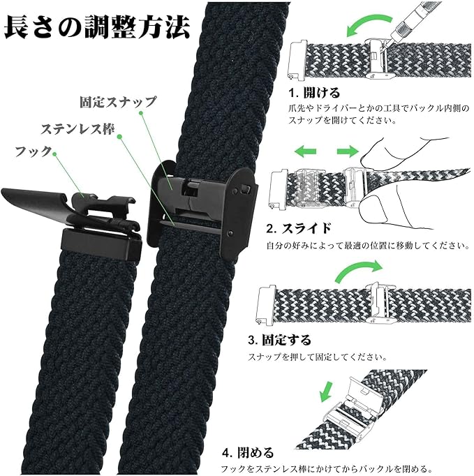 【無段階調整】手首サイズを自由に調整できるブレイデッドソロループ風時計ストラップです。バックルの位置を調整することによって緩めが好きな人もキツめが好きな人も手首サイズを自由に変えることができます。