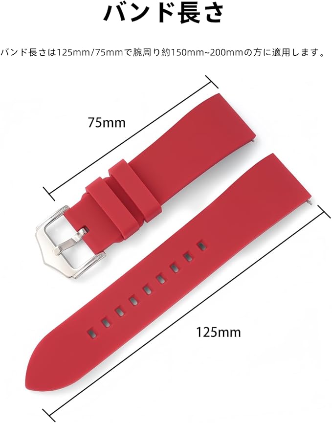 バンド長さは125mm/75mmで腕周り約150mm~200mmの方に適用します。つまみ付きのスプリングバー付きなので、工具なしで時計バンドを交換できます。