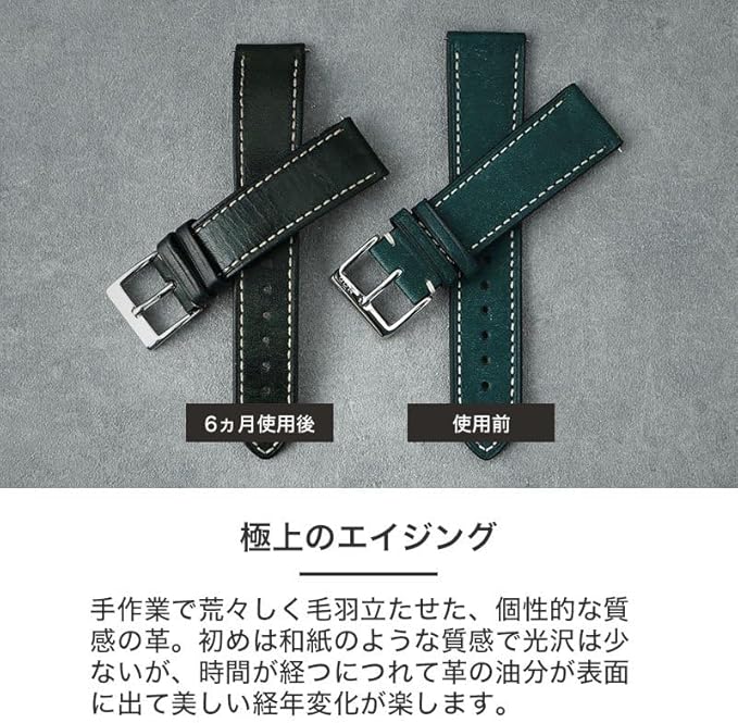 イタリアンレザーの最高峰「プエブロレザー」を採用した他とは違うワンランク上のレザーベルト。プエブロレザーはバケッタ製法で作られており、牛脚油を浸透させ、表面をザラつかせる加工が施されています。この独自の加工により、レザーは年月を経るごとに美しい経年変化を遂げます。使い込むほどに艶が増し、深みのある色合いへと変化するプエブロレザーならではの個性的なエイジングをお愉しみください。