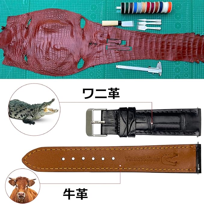 [vietnamcreations] 19mm ブラック クロコダイル腕時計ベルト クイックリリース ワニ革交換用時計バンド 腕首バックル付き手作りメンズ ハンドメイド 黒 DH-01-19MM