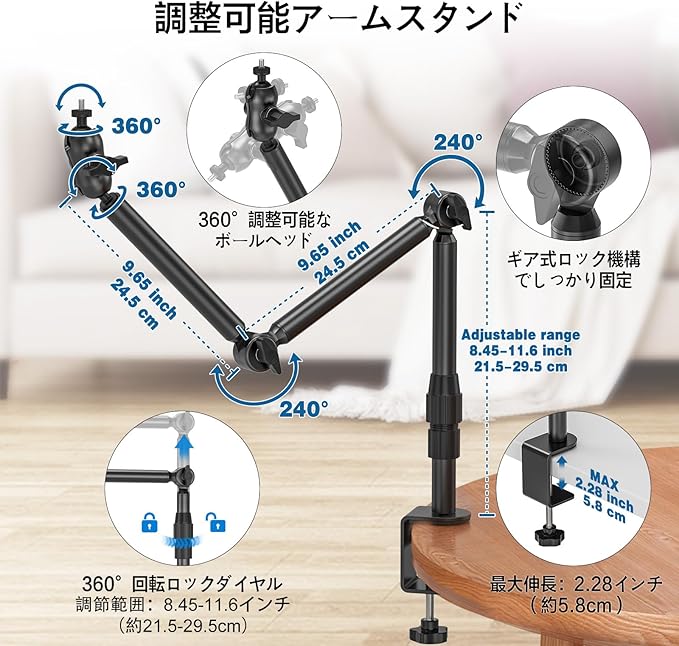 【伸縮式カメラアームで広がる可能性】最大78.4cmまで延伸。 軽量かつ折り畳み可能なこのカメラアームは、収納性に優れています。ベースノブで高さを21.4cm~29.4cmの間で調節可能。さらにアームを最大78.4cm(約30.9インチ)まで延伸でき、多様なシチュエーションに対応します。