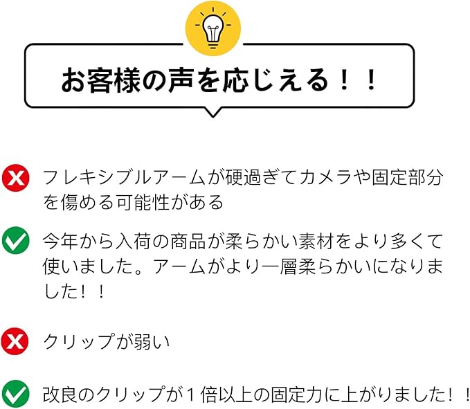 <p>❀❀最新版のウェブカメラ スタンドに対して自信が持っていますが、初期不良とご購入日から1年間以内に何かございましたら、ご連絡お願い致します、対応させていただきます。</p>