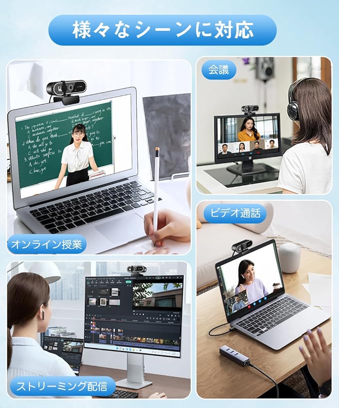 【HD光補正・フォーカスレンズ】自動光補正機能を搭載するウェブカメラ は、環境にあわせて自動的に光量バランスやホワイトバランスを調節し、照明条件に影響されることなく明るくきれいな映像を提供します。レンズがピンとを自動で合わせてくれるので,力メラや被写体の位置を調整する必要があリません。