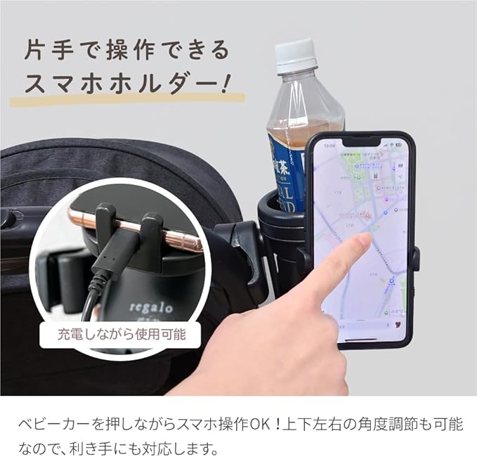 【片手で簡単装着!スマホホルダー】ベビーカーを押しながらスマホ操作OK!360度回転で好きな角度に調整可能。充電しながら使えるから、長時間のお出かけも安心。