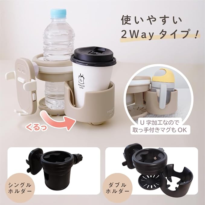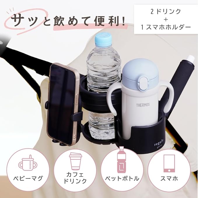regalo ベビーカー ドリンクホルダー カップホルダー スマホスタンド付 携帯 角度調節 2本収納 日本語説明書付き (【ダブルクランプ】JTブラック)
