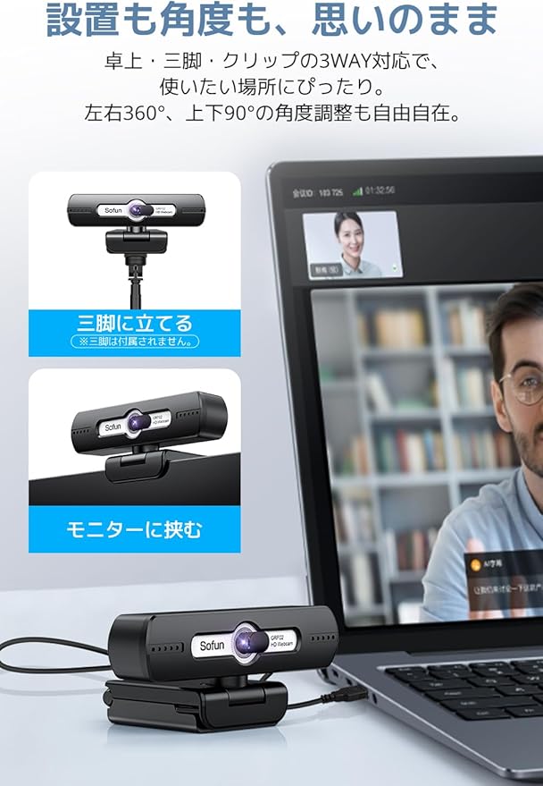 【90 広角レンズ&360 角度調整・柔軟な設置対応】90度の 広角レンズ を搭載し、個人使用はもちろん、複数人のミーティングにも対応。さらに左右360度・上下90度の角度調整が可能で、どんな角度からでも思い通りのアングルで撮影できる Webカメラ 広角 。三脚・クリップ・卓上の3WAY設置にも対応しており、柔軟に使える外付けカメラとしてあらゆる使用シーンにフィットする 外付けカメラ 。