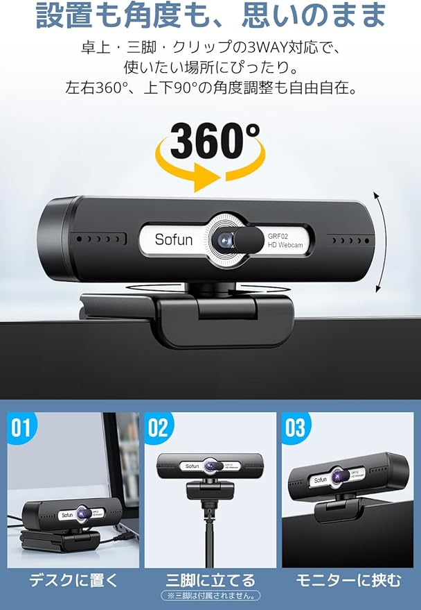 【90 広角レンズ&自由な角度調整】 90 の 広角レンズ で、ひとりはもちろん複数人でも画面にしっかり収まる ウェブカメラ 高画質 。さらに左右360 、上下90 まで自在に 角度調整 できるため、設置場所を選ばずストリーミングやオンライン授業などにも活躍する WEBカメラ 小型 です。