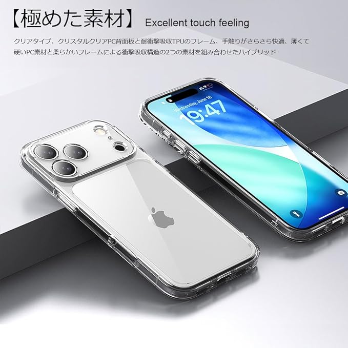 【手触り感の良い素材】黄変防止高品質TPUを採用しており、今までにない高級感と美しさを実現しました、弾力性と耐久性にも優れているので、長くお使いいただけます。背面はつるつるとした手触りで、コーティングはしっかりとしています。濡れた手や乾いた手、どんな手で触っても滑り止めのグリップ感で、スマホを落としにくい設計となっています。
