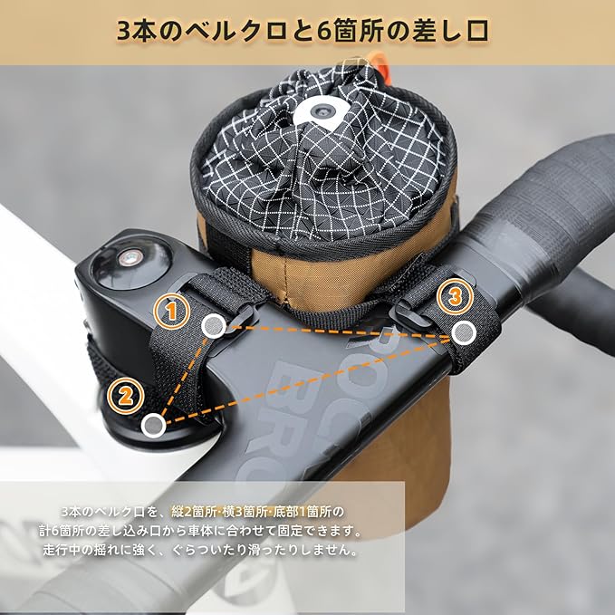 【多様な取り付け方&しっかり固定】この自転車ドリンクホルダーは、脱着可能な滑り止めベルクロが3本付いており、差し込み口は縦向きに2箇所、横向きに3箇所、底に1箇所と計6箇所あり、お好きな場所に自由に取り付けることができます。自転車の種類や取り付け位置を問わず、多様な使い方でしっかり固定できます。また3点でしっかり固定することで、凸凹道や自転車の揺れにもしっかり対応。