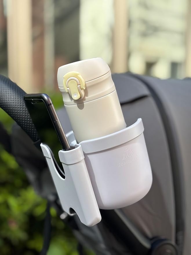 2in1のドリンクホルダー。スマホは横幅約8.0㎝、ドリンクは直径約7.5㎝までのものを入れることが可能です。ボトルホルダーの内側には4つの弁が付いているため、ベビーカー走行中に揺れてもボトルやカップをしっかり固定してくれます。