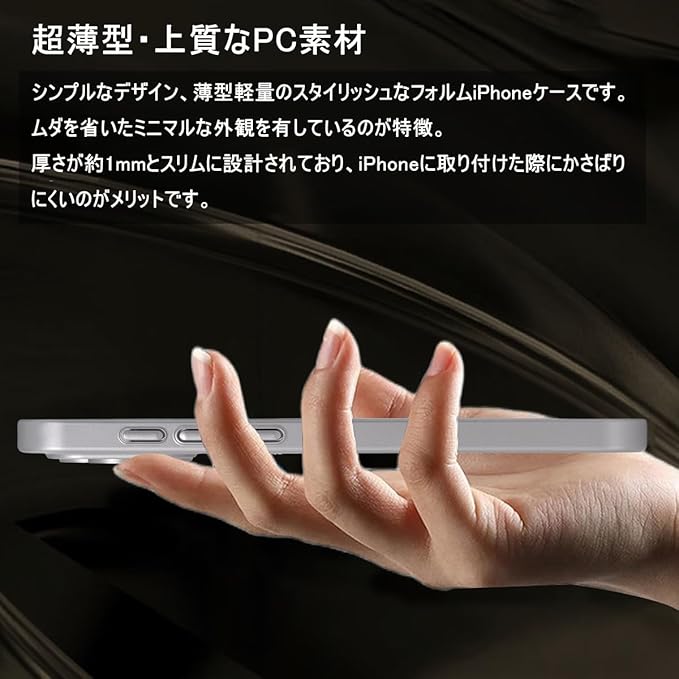【超薄型・上質なPC素材】シンプルなデザイン、薄型軽量のスタイリッシュなフォルムiPhoneケースです。ムダを省いたミニマルな外観を有しているのが特徴。厚さが約1mmとスリムに設計されており、iPhoneに取り付けた際にかさばりにくいのがメリットです。本製品は上質なポリカーボネート素材を採用、プラスチック素材の中でも最高の耐衝撃性を誇る素材です。手触りも良い、マット加工が施された表面は汚れや指紋が付きにくいも魅力です。スマートフォン本来の美しさを損なわずに保護します。