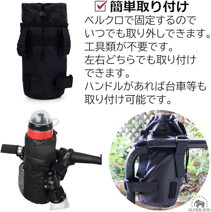 ハンドルバーにつける自転車用ドリンクホルダー です。ペットボトルに対応しています。口は巾着型で、小型のハンドルバーバッグにもなります。
