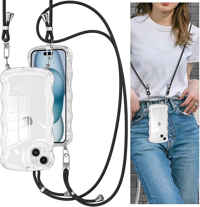 QLTYPRI ケース iPhone 17 Pro Max 用 ケース クリア TPUカバー 調節可能な ショルダー 肩がけ 首掛け 紐付き 斜めがけ ウェーブ おしゃれ 韓国 可愛い アクスタ収納 透明 薄型 軽量 耐衝撃 スマホケース ワイヤレス充電対応 ストラップホール付き アイフォン17Pro Max カバー 6.9インチ 対応