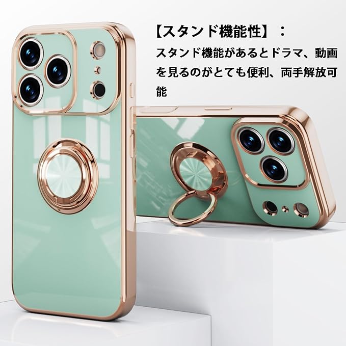 スマホケース 対応 iPhone 17 Pro Max 用 ケース リング付き メッキ加工 レンズ保護 tpu ソフト ストラップホール付き 耐衝撃 スリム おしゃれ 携帯カバー アイフォン17プロマックス 用 ケース (グリーン)