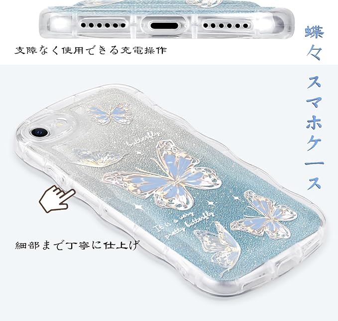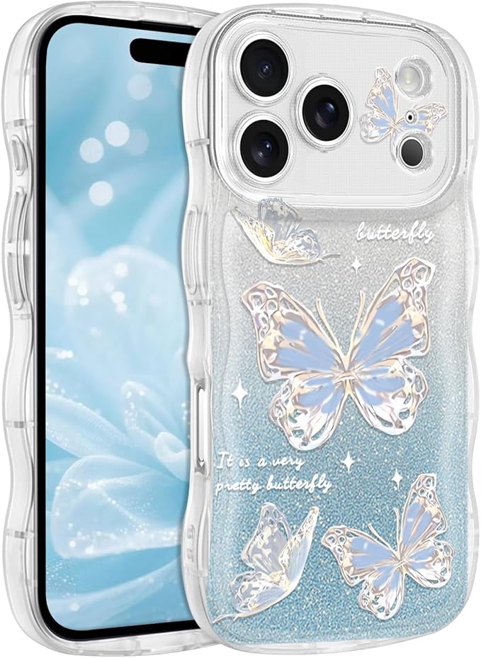 MuZiF iPhone 17 Pro Max 用 ケース クリア キラキラ 可愛い ちょう ウェーブ TPUソフト 透明 かわいい 韓国 薄くて軽い 人気 おしゃれ スマホケース 耐衝撃 携帯カバー 17 Pro Max 用 クリアケース (iPhone 17 Pro Max 用,ブルー)