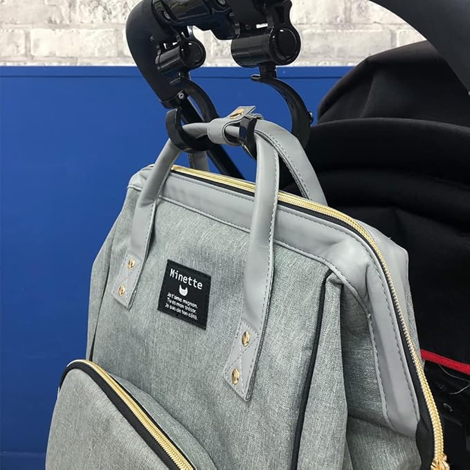 【360度回転】フック部分は360度回転するため、どの向きからも荷物をかけられ、非常に便利です。赤ちゃんを抱っこしながらでも、簡単に荷物をかけることができます。