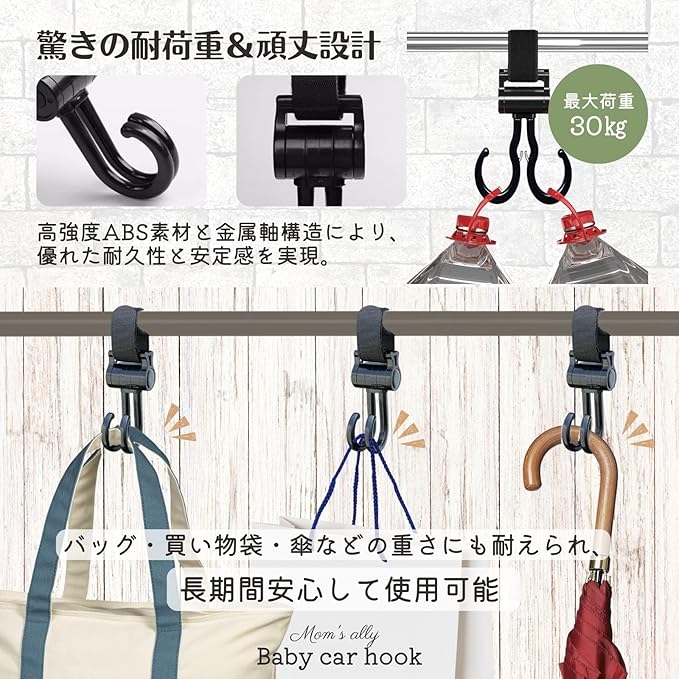 「ママが使いやすい」を形にした、360度回転&180度上下可動のベビーカーフック。荷物を掛ける方向を自由に調整できるため、限られたスペースでも邪魔にならずスマートに使用可能です。軽量ながらも頑丈な設計で、バッグや買い物袋をしっかりホールド。取り付けも簡単で、忙しいお出かけ時でも快適に使えます。シンプルながら洗練されたデザインで、日常の育児シーンをスタイリッシュにサポートします。